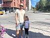 Imens Bjørn Erik Korum Hansen har lunsj har Jenny Korum Berger dratt med seg pappa ut for en spasertur i sola.