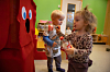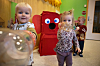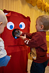 Alt takket være «Pantorangen» – den røde figuren som følger nøye med. Ganske søt, og alltid sulten på flasker. Barna sørger for at han aldri går tom for «mat».