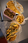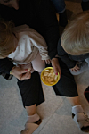 Antonia henter frem en pose med hatter, flagg, rislamper og riskjeks- suvenirer fra Vietnam. Barna får smake, og riskjeksen faller i god smak.