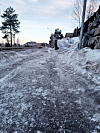 SKIVEIEN: På fortauet i Skiveien, som for øvrig er en fylkesvei, ligger det et tykt og vanskelig fremkommelig islag.