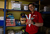 Bak på lageret viser Meliha frem det som er donert. Alt er nøye organisert i hyller, og selvlagde bursdagskort ligger klare til bruk.