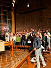 Engangskoret er et prosjektkor knyttet til Sofiemyr kirke. De møtes 1–2 ganger i året og det er åpent for alle å være med. Denne gangen har de hatt 3 øvelser og føler de er godt forberedt til søndagens happening. Koret stiller med 100 sangere fra 25–60 år og menighetsmusiker Katrine Flaa dirigerer den store gjengen med stø hånd.