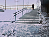 Derrick vil ikke begi seg ned trappen denne dagen, men mens vi står og prater er det flere andre som «tar sjansen». Nederst i trappa lå det et felt med is og selv om det er forsøkt strødd, observerte vi flere forbipasserende med problemer.